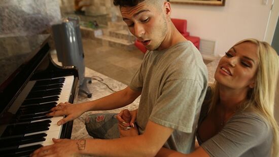 Урок музыки стал постепенно набирать обороты, когда молодая мачеха, стала очень сильно нагибаться перед парнем а затем и вовсе села ему на руки что бы показать ему по ближе как нужно работать пальцами. Почувствовав что парень уже начал возбуждаться, красотка залезла под рояль, достала из трусов член парня и принялась жадно сосать его. После этого они перешли на диван, где молодой и невеуверенный сынок, уже во всю ставал мужчиной!